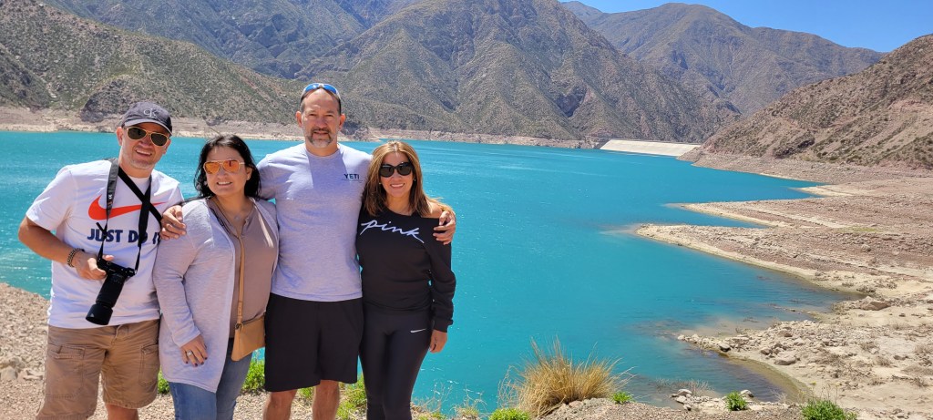 La primer parada fue en un embalse del rio Mendoza, que se llama ‘Embalse Potrerillos’. El agua de este embalse es imposiblemente azul. Pregunté por ahí, y me dijeron que el color se debía a un alto contenido de sulfato de cobre del agua que baja de los nevados. Como quiera que sea, lo que ven en las fotos no es cuestión de efectos de computador o de la cámara. Tal cual era como veíamos el agua en ese embalse.