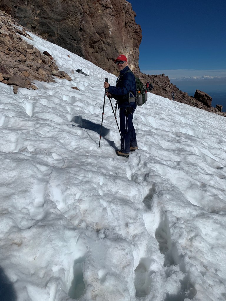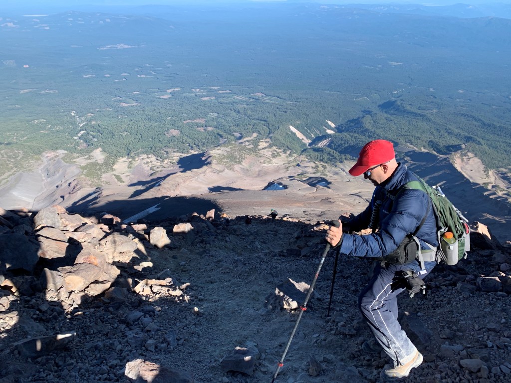 Una luz se prendió cuando agarré mi GPS y accioné su botón de encendido para ver qué pasaba. Fue mucha la felicidad que tuvimos cuando vimos que el aparato simplemente mostró un mensaje que decía que no tenía suficiente batería para vibrar o para iluminar la pantalla al 100%, pero nos mostraba adonde estábamos en el mapa, nos mostraba lo que tenía grabado de nuestra subida, y, lo absolutamente mejor de todo, nos mostraba que la trocha por la que veníamos era exactamente la que necesitábamos, y continuaba solo unos pasos delante de donde estábamos en ese instante. Esto ocurrió a 10,000 pies, mas o menos a las 10 de la noche.