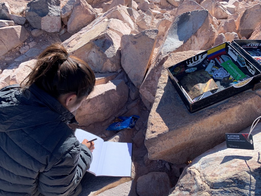 We found another person who was going back, to whom we asked the routine questions: How long to the top? Which is the best way? I also asked him if he had signed the logbook on the summit. He answered me asking if that wasn’t a joke; He said that he had heard about the book but that since he did not see it, he thought it must have been a joke. I assured him that it was not a joke; that I had not only signed it four times but had also put a sticker of my country’s flag in the box where the book is. I also told him that he should come back with us, that the summit was close and that it would take him at most an hour to do that.