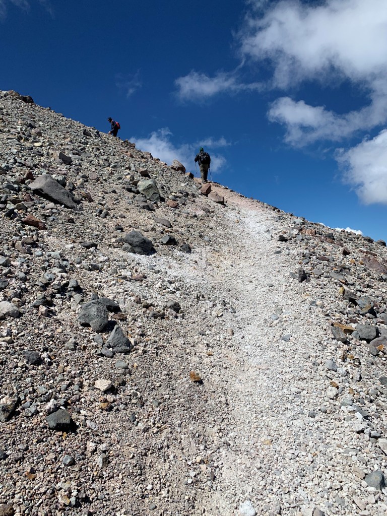 My mind started bursting: What if we continue but it hurts more farther down? What if we stay here and I call the ranger? Then what? Will they send a copter to throw us a tent? The biggest problem was that: It was getting dark and we had no protection for the coming weather. I thought the only thing we could do would be to get under the ‘mushroom’ rock, but we didn’t really have gear to protect ourselves from the freezing temps of the night at that height. I was seeing a situation that could get very critical. Valentina started walking and told me that she felt she could continue. I didn’t express any of my panic to her so she wouldn’t worry more, but I kept walking by her side, keeping an eye on every step she took. I looked at my watch. We had almost two hours of daylight left, which was phenomenal. The path was very clear and what made it difficult to walk up (scree and sand) was something to our advantage going down, because each step slid a little further, effortlessly.