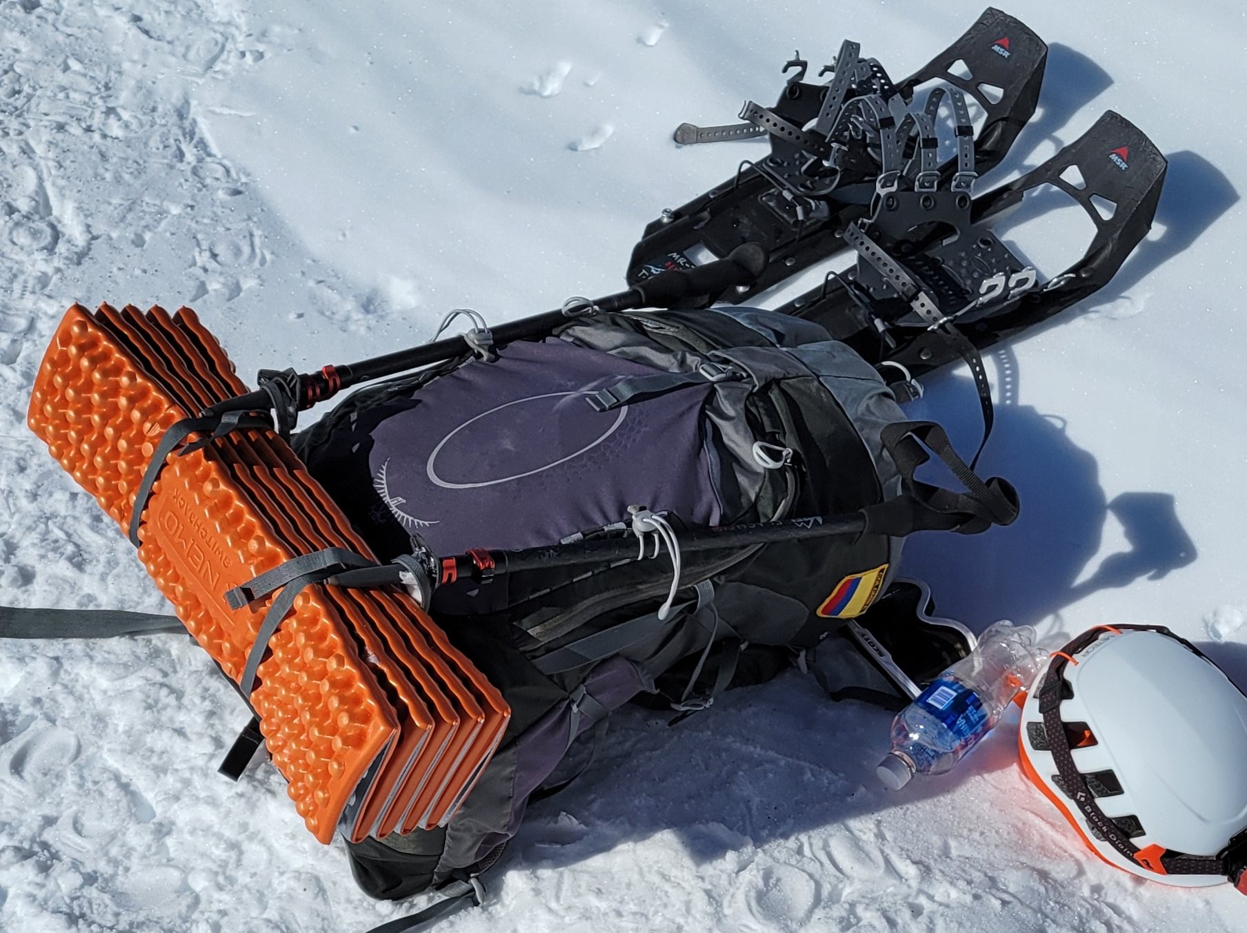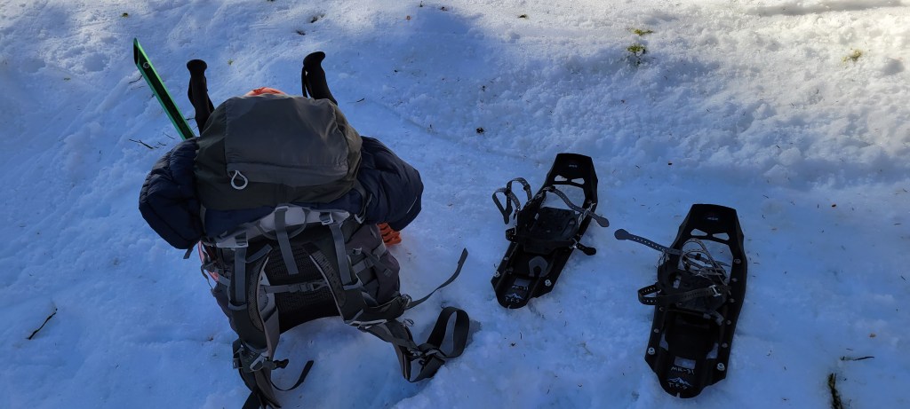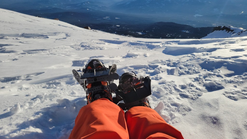 En el regreso me pasó una cosa bacana y extraña. Es costumbre en estas montañas, uno sentarse y bajar deslizado si la ladera tiene inclinación que permita esto, pero también la nieve tiene que estar en un punto clave. Yo me deslicé unas 3 veces, pero después fue más el esfuerzo por empujarme que cualquier ganancia de avance, entonces seguí caminando. Fue en esa última deslizada que vi que había perdido una de las plataformas para caminar en la nieve que había rentado. Di dos pasos para comenzar a subir la ladera que había acabado de bajar, deslizado, cuando pensé que no, que me costaría menos pagar lo que fuera en el sitio donde había rentado esas plataformas, que el esfuerzo que tendría que invertir subiendo esa ladera, sin estar siquiera seguro de que allí mismo encontraría la que se me perdió.