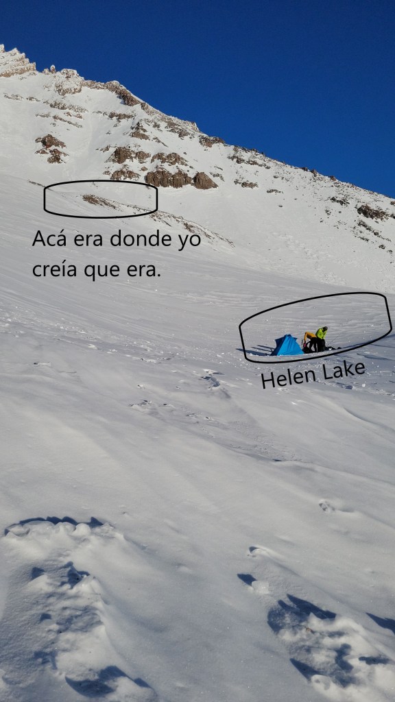 Cuando llegué al sitio donde siempre armo la carpa, había una pareja ahí, desarmando su carpa. Me pareció que no era ese el sitio, pues no me cuadraban los tiempos. Lo que quiero decir es que esperaba al menos una hora mas de camino, entonces pensé que otro sitio que se veía un poco más arriba debía de ser la base. Esa zona se llama ‘Helen Lake’. Me despedí de la pareja y continué mi camino.
